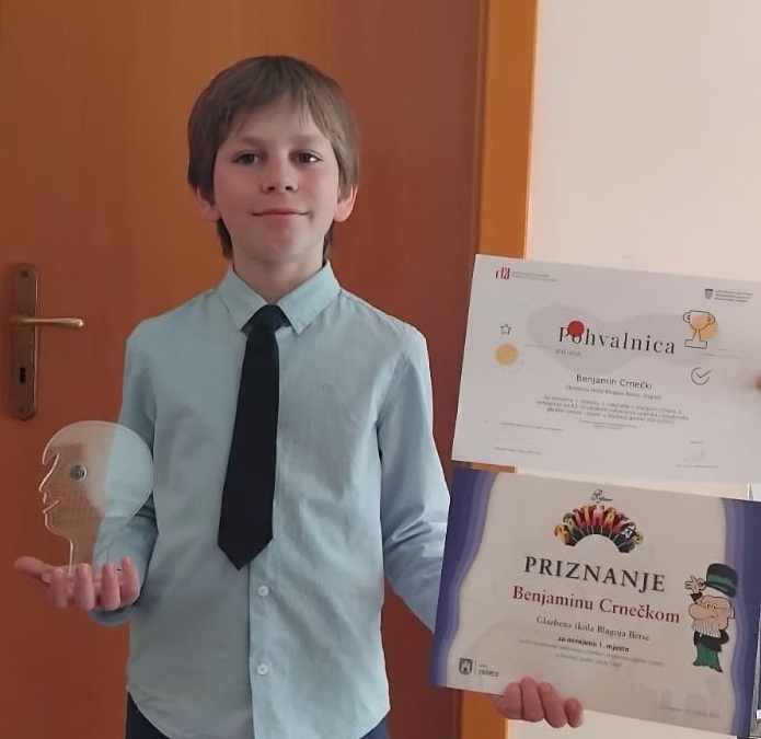 Našem učeniku 5. c razreda, Benjaminu Crnečkom, prije nekoliko dana svečano je uručena nagrada Oskar znanja za 2024./2025. godinu. Benjamin je primio i nagradu grada Zagreba Baltazar kao priznanje za ostvarene uspjehe u glazbenim natjecanjima: prvo mjesto na županijskom natjecanju gitarista, prvo mjesto na državnom natjecanju gitarista te drugo mjesto na međunarodnom natjecanju gitarista.