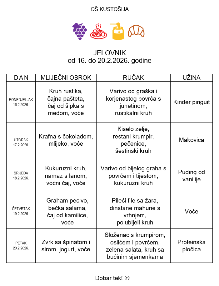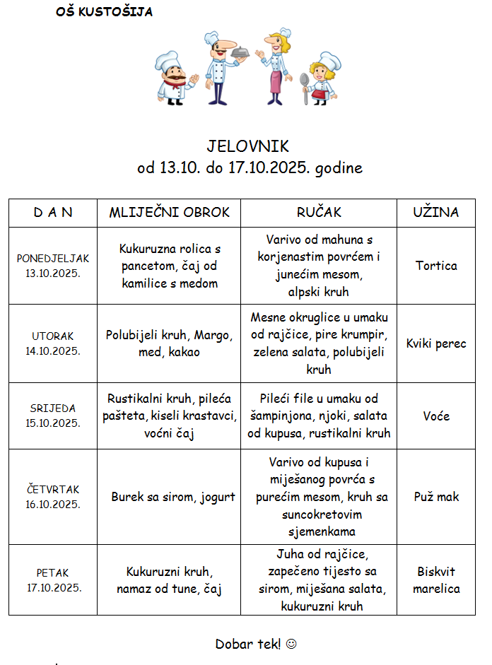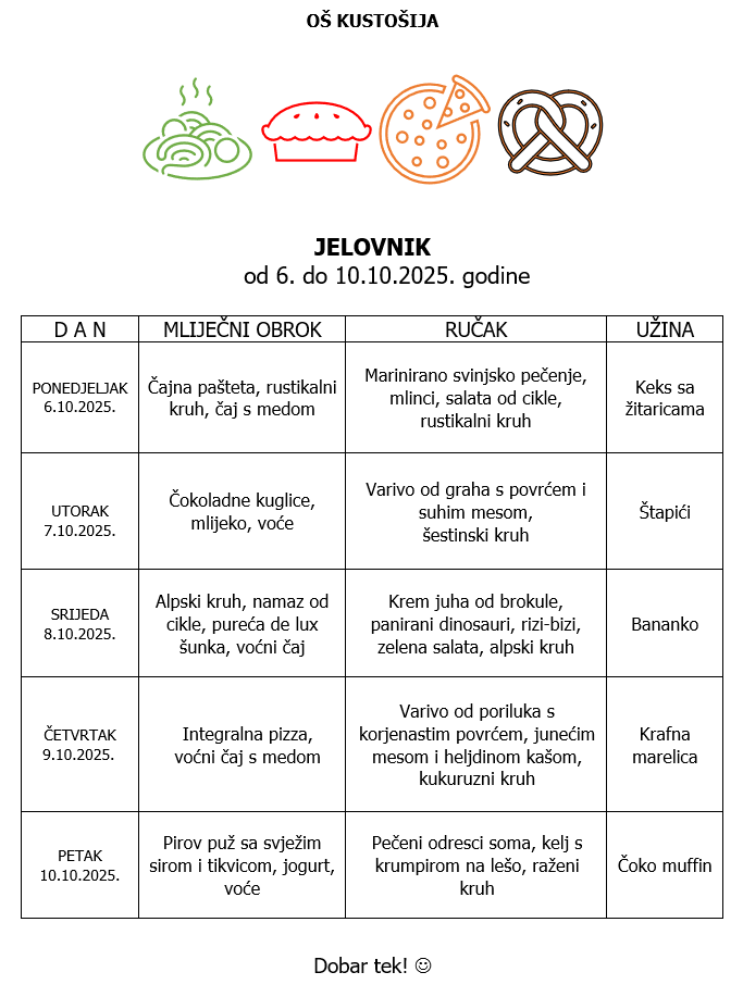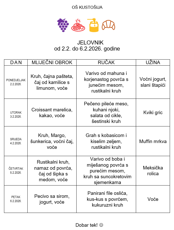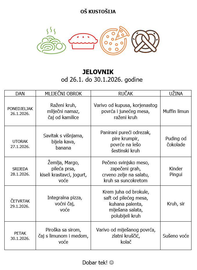 Škola zadržava pravo izmjene jelovnika u slučaju nemogućnosti osiguranja predviđenih namirnica.
